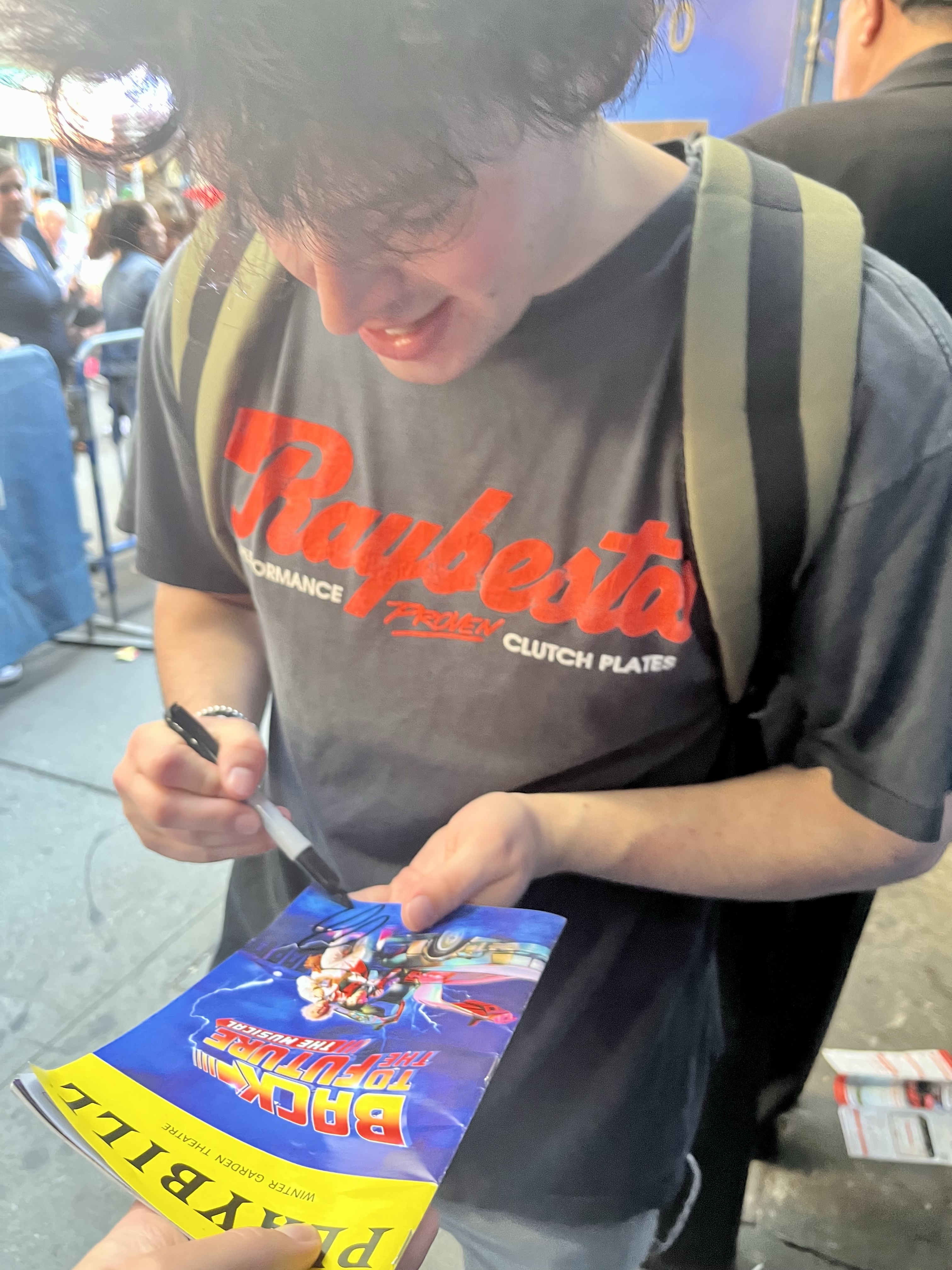 Casey Likes joined this show as Marty McFly and truly held his own. He channeled Michael J. Fox right down to the voice cracks, and was an excellent scene partner to Roger Bart. Likes was also ready and willing to meet fans by the stage door promptly after the show, and was quite charming. Thanks to him, my son has his very first autographed playbill!