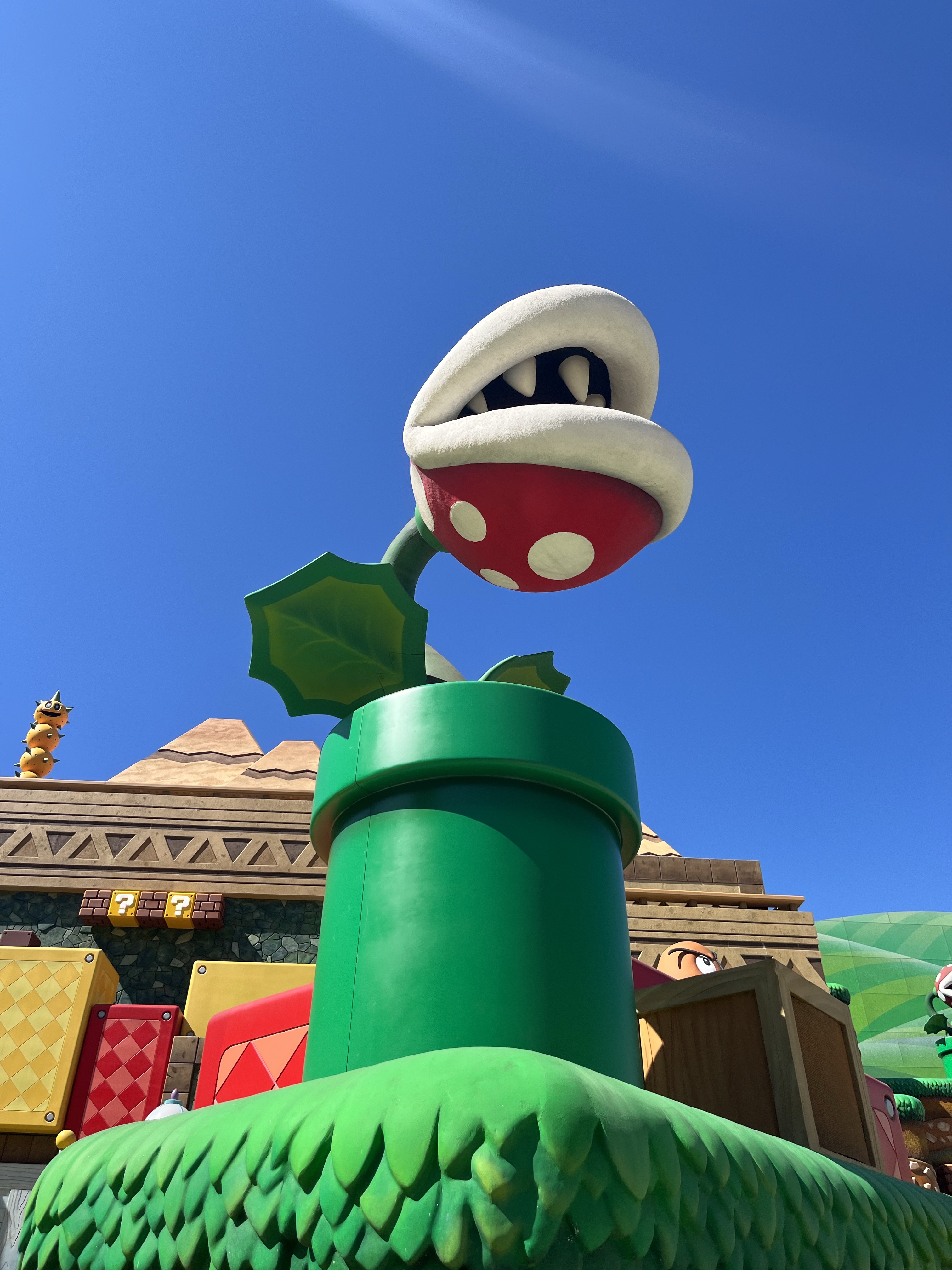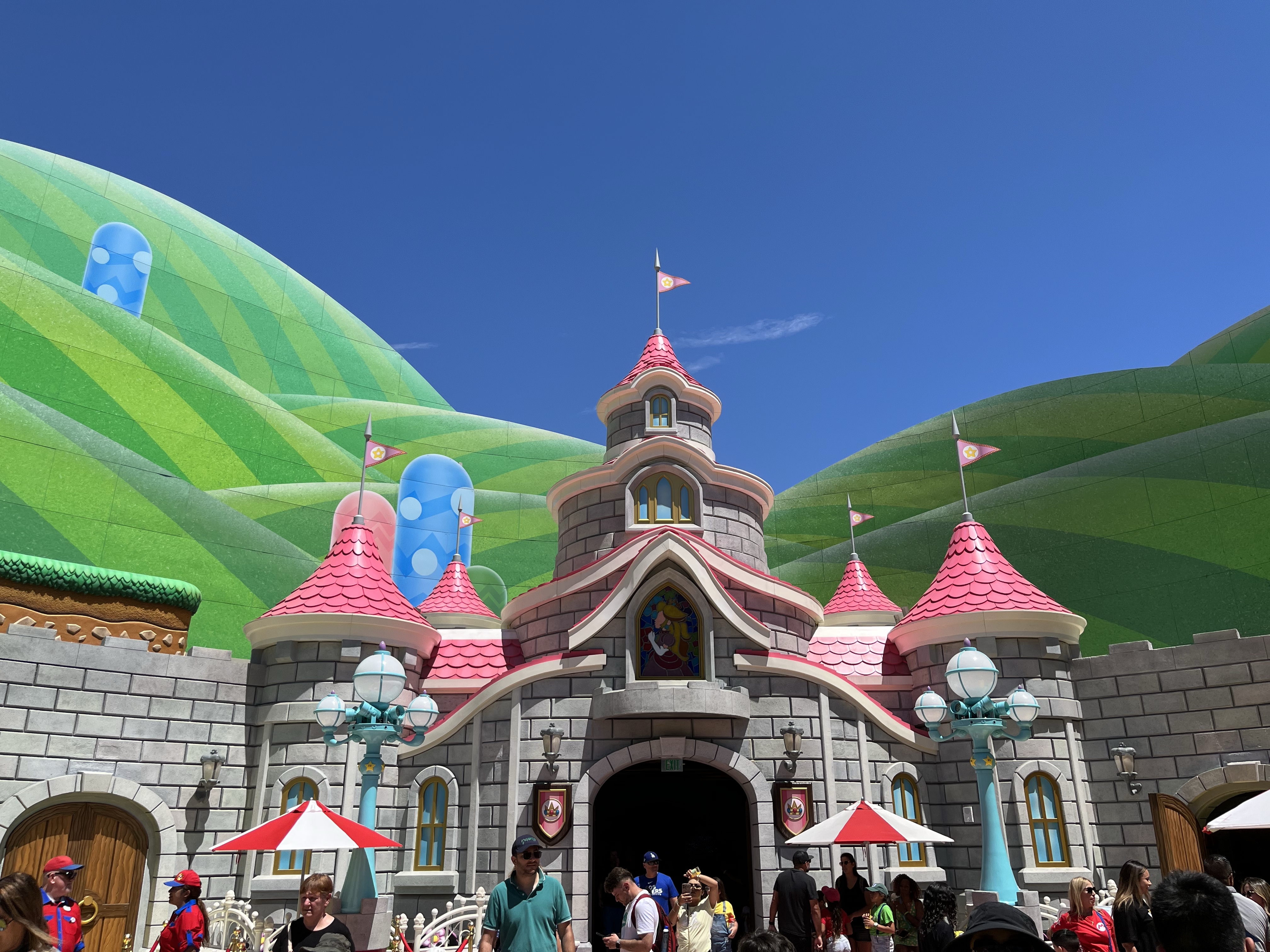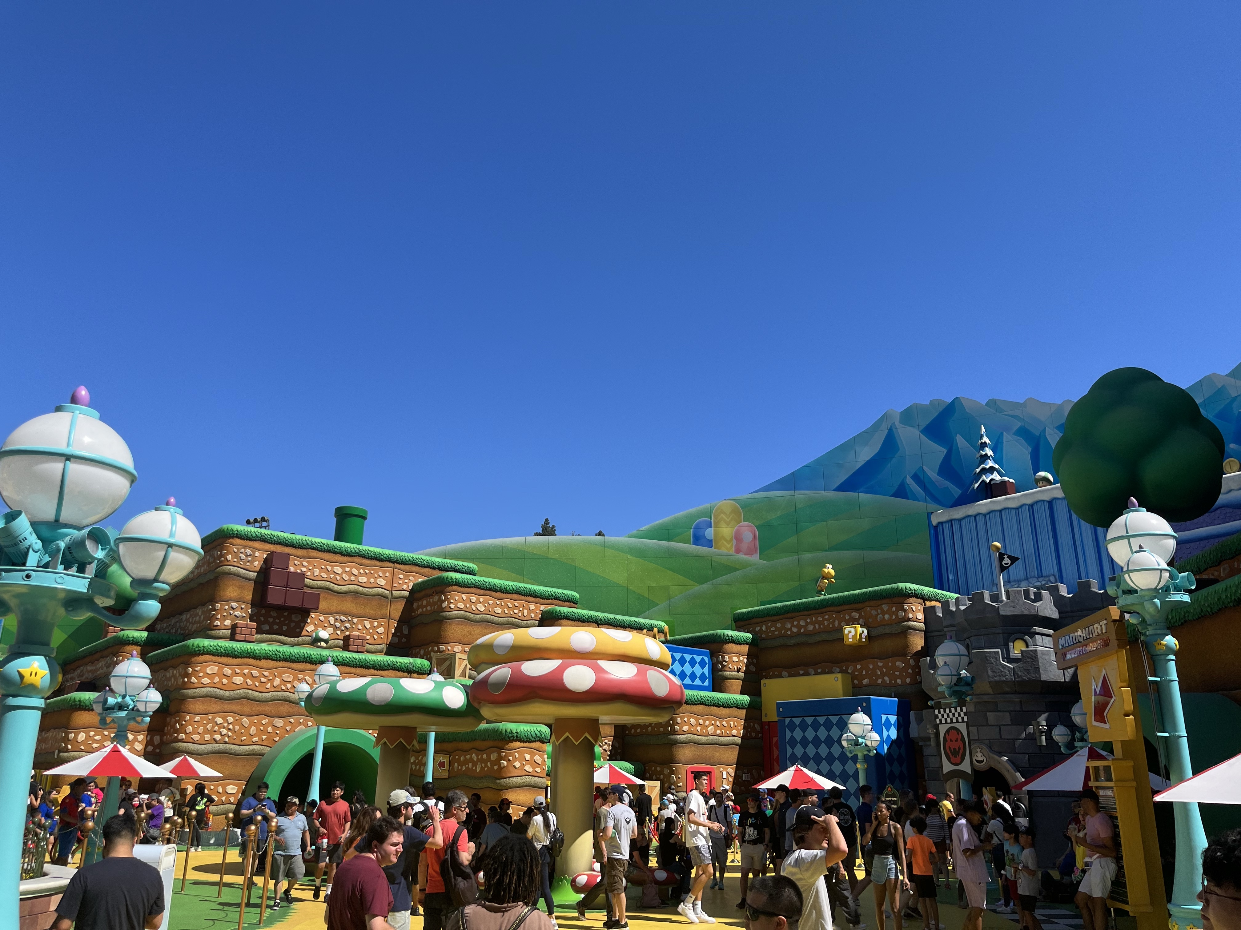 Super Nintendo World at Universal Hollywood is basically shaped like a giant circle. Upon exiting the pipe that brought you inside, Peach’s Castle will be directly in front of you and you’ll be surrounded by the rolling green hills of Mushroom Kingdom, speckled with colorful piranha plants, Goombas, and Koopa Troopas. After taking lots of pictures and smiling at all the immersive Instragrammable details, you can start playing throughout the land!