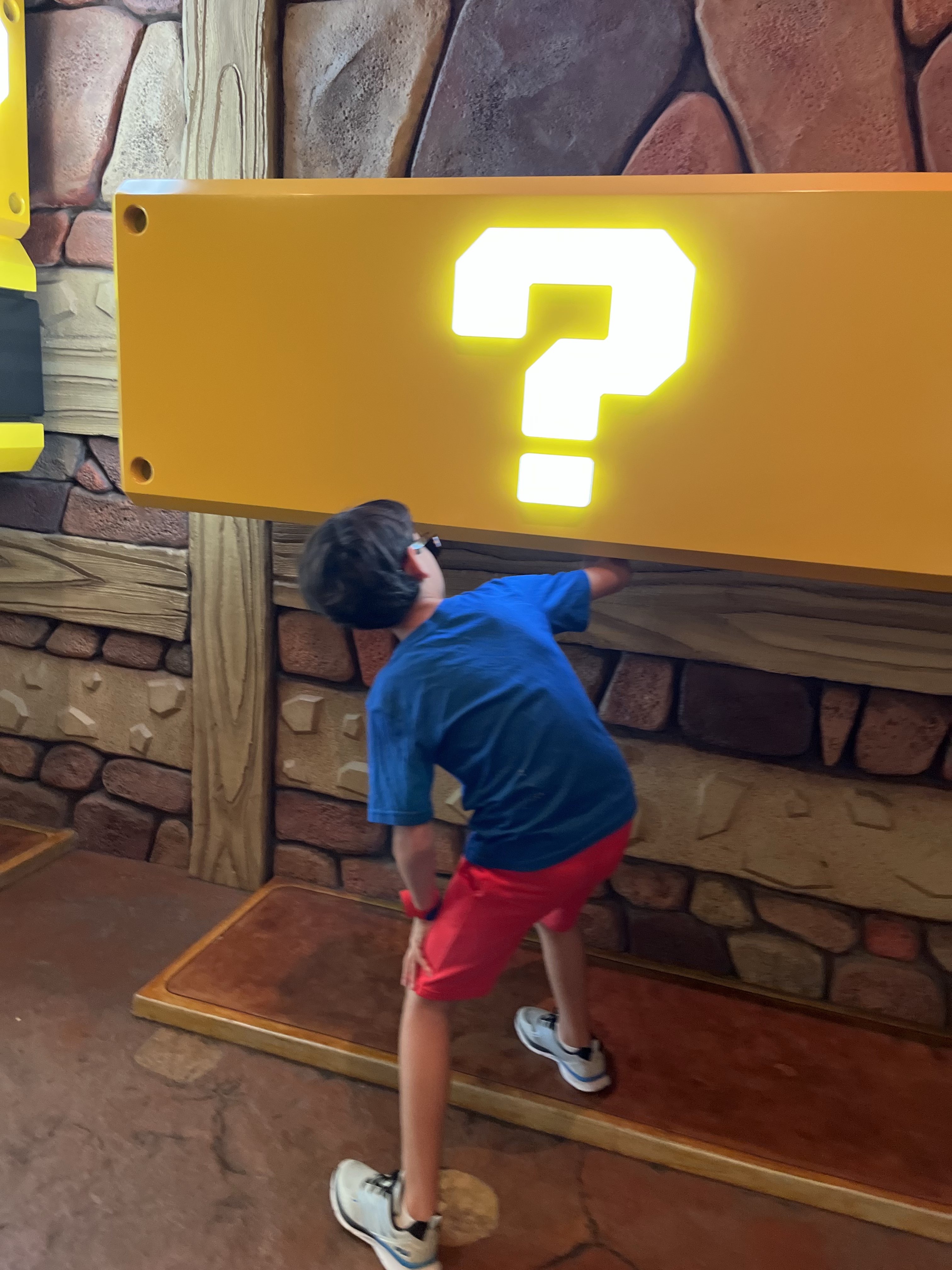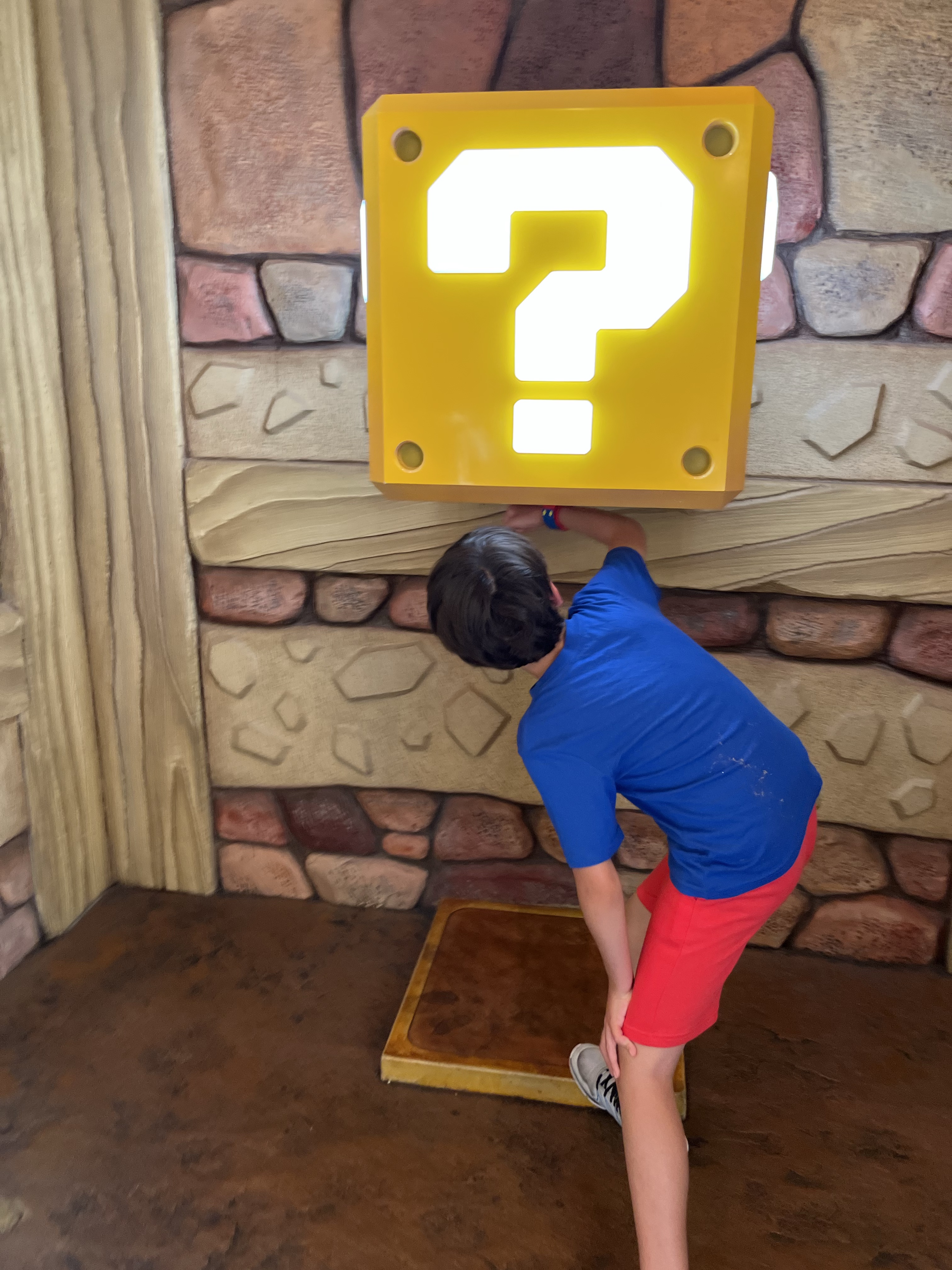 Super Nintendo World’s priciest gimmick is its Power-Up Band. These interactive snap bracelets are sold at the land’s gift shop and electronic vending machines. They come in six varieties: Mario, Luigi, Princess Peach, a Super Mushroom, Yoshi, and Princess Daisy, and sell for a hefty $40 each. It’s an overpriced investment for a family with multiple kids, so in my opinion you can enjoy the land without one. (But, not according to my son, so we bought them.) Since about half of the entertainment is interactive, a Power-Up Band does enable you to enjoy the full experience of Super Nintendo World. Connect your Power-Up Band to your Universal app and you can keep score as you punch life-size question blocks, scan stamps, and win challenges throughout your day.