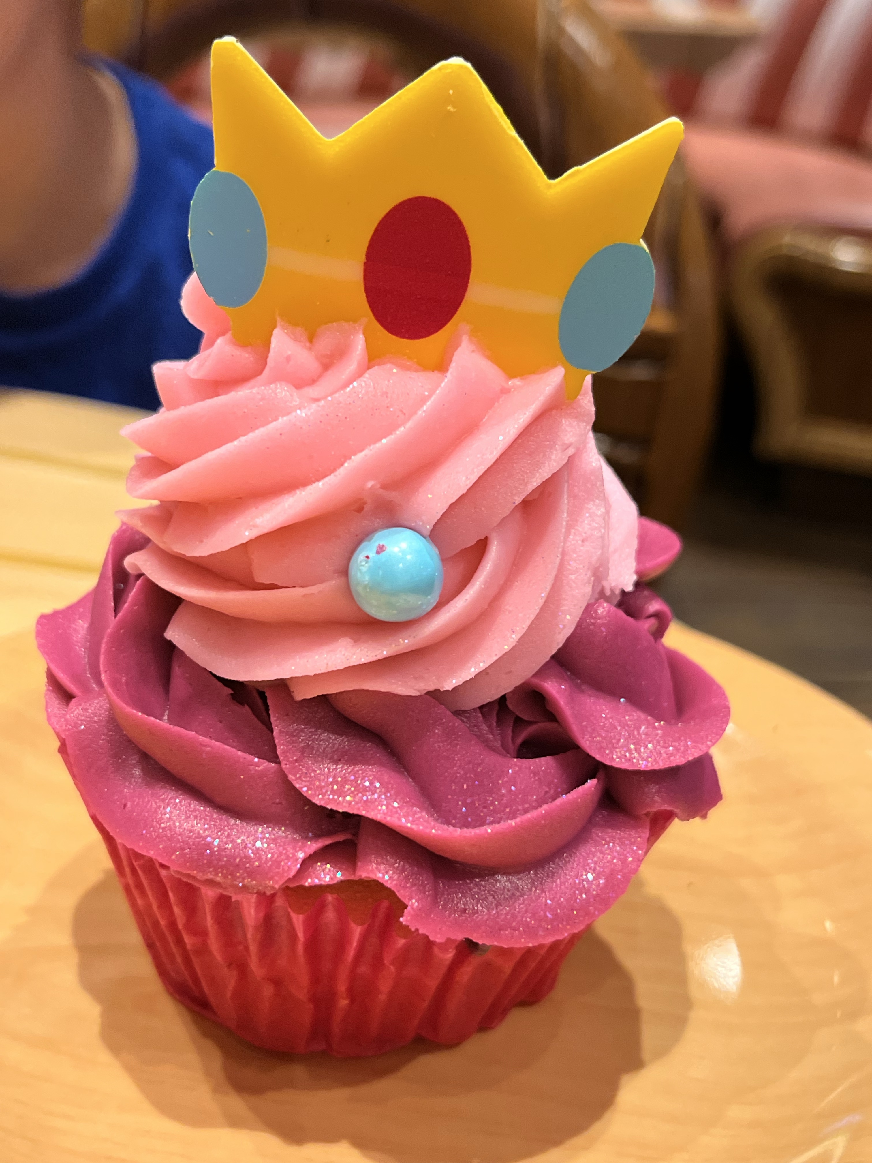 I love a good Caprese salad, so for my appetizer I ordered the Piranha Plant Caprese ($12.99) with tomatoes, fresh mozzarella, asparagus, and basil. It was plain old boring, had little flavor, and wasn’t much of a Caprese salad, so I’d only give it a 5/10. I also ordered the Luigi Burger ($16.99) which is pesto grilled chicken, basil pesto, Swiss cheese, green pepper, and spinach served on a brioche bun with a side of truffle French fries. It was a decent chicken sandwich and I’d give it a 7/10. For my dessert I ordered the ? Block Tiramisu ($9.99) which I thought was picture-perfect but tasted terrible, straight down to the truly un-Italian Cool Whip it was made with. I give it a 2/10 for taste, but order it if you want an adorable food photo. My son ordered a “kids’ meal” called the Mario Mini Burger Adventure Set ($14.99). It came with a cheeseburger, truffle French fries, corn on the cob, broccoli, and a coin cookie. He really enjoyed it and gave it a 9/10. For dessert he ordered the Princess Peach Cupcake ($9.99) which is a raspberry-filled Funfetti cupcake with buttercream frosting and a Princess Peach chocolate crown. We both enjoyed this but agreed it didn’t need the raspberry filling, so we gave it a 9/10.