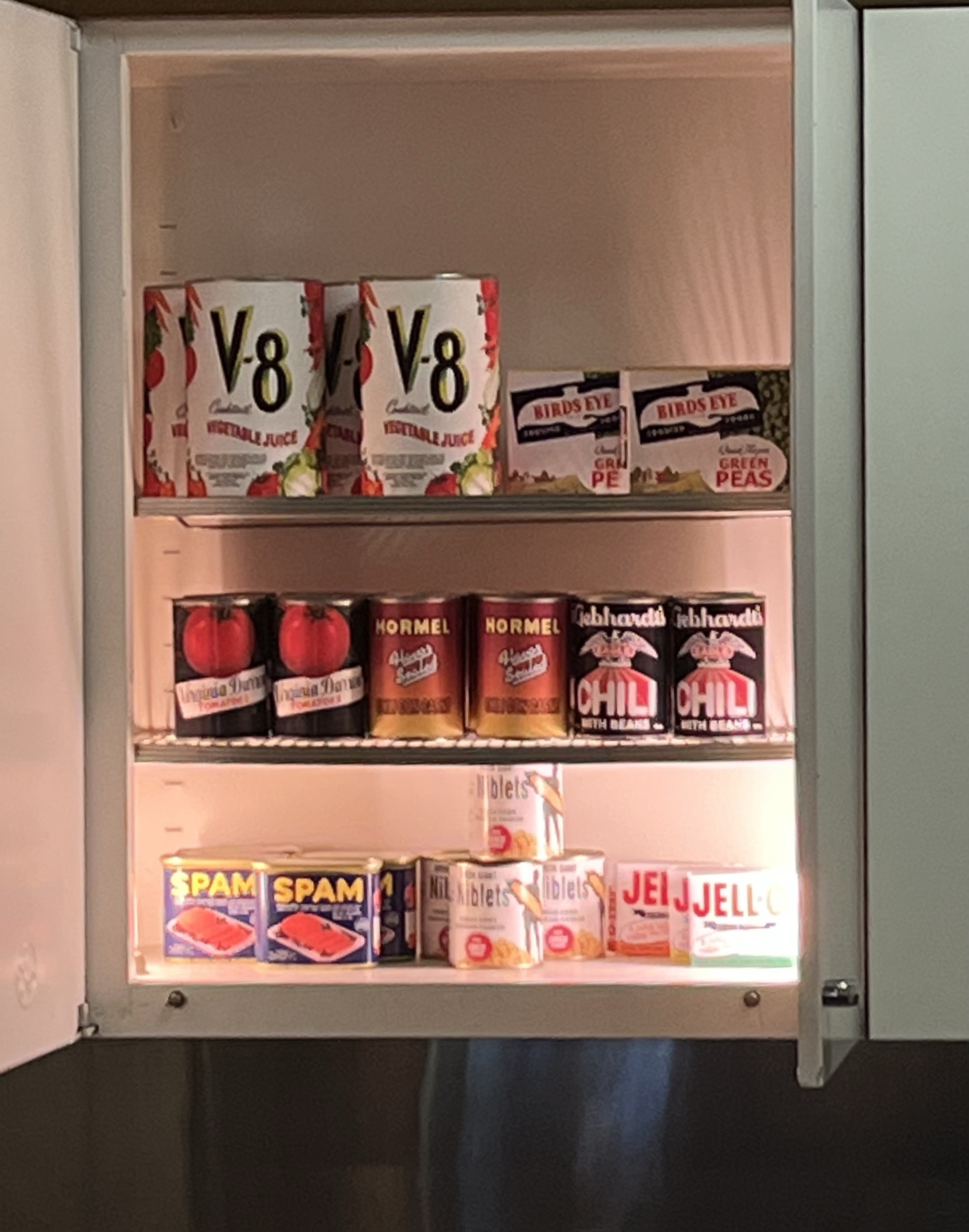 The space also had a small kitchen with light-up cabinets custom made by GE and stocked with 1960’s comfort foods that Walt loved.