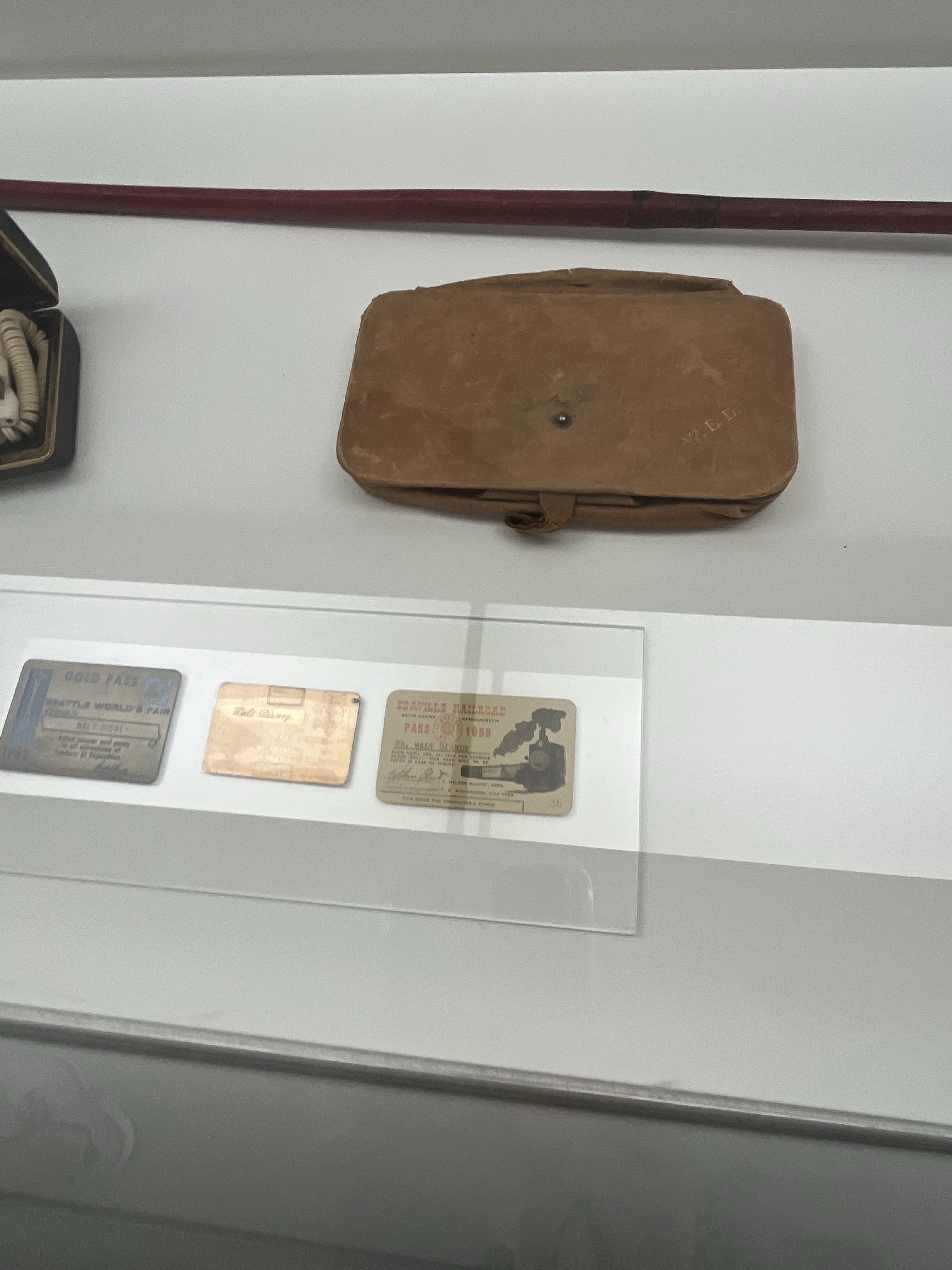 Another “museum-like” exhibit was a glass case displaying a collection of Walt’s personal items. We saw things like his eyeglasses, hat, and monogrammed bag.
