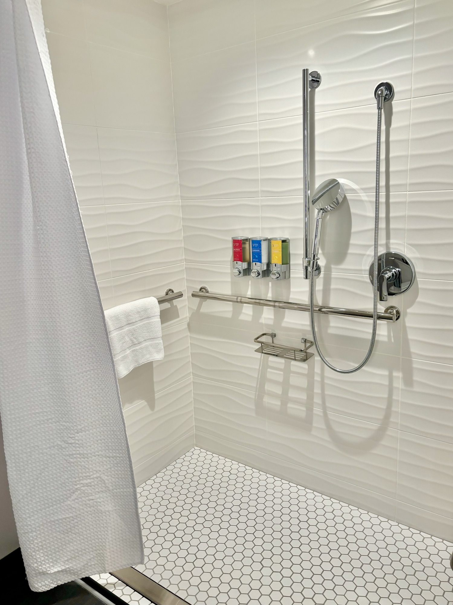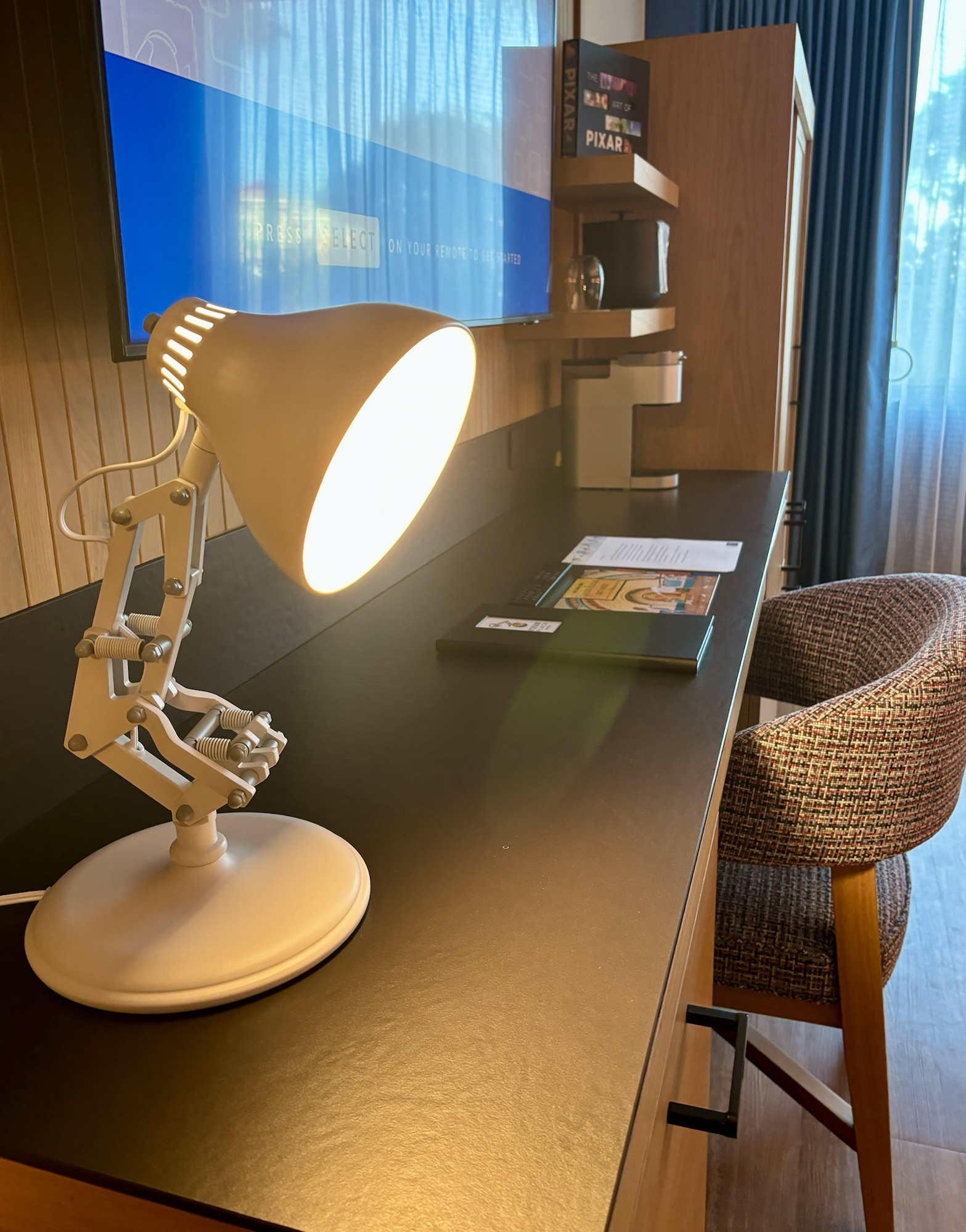 The bathroom was bright and white with touches of Pixar’s primary colors and Luxo at every turn. I didn’t care for the open-concept, horizontal shower, its weirdly-placed shower heads, or the curtain instead of a shower door, but it was the only aspect of the room I didn’t love since everything else was great.