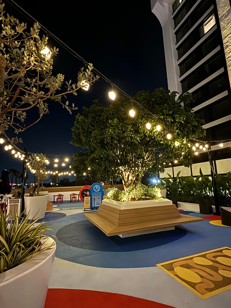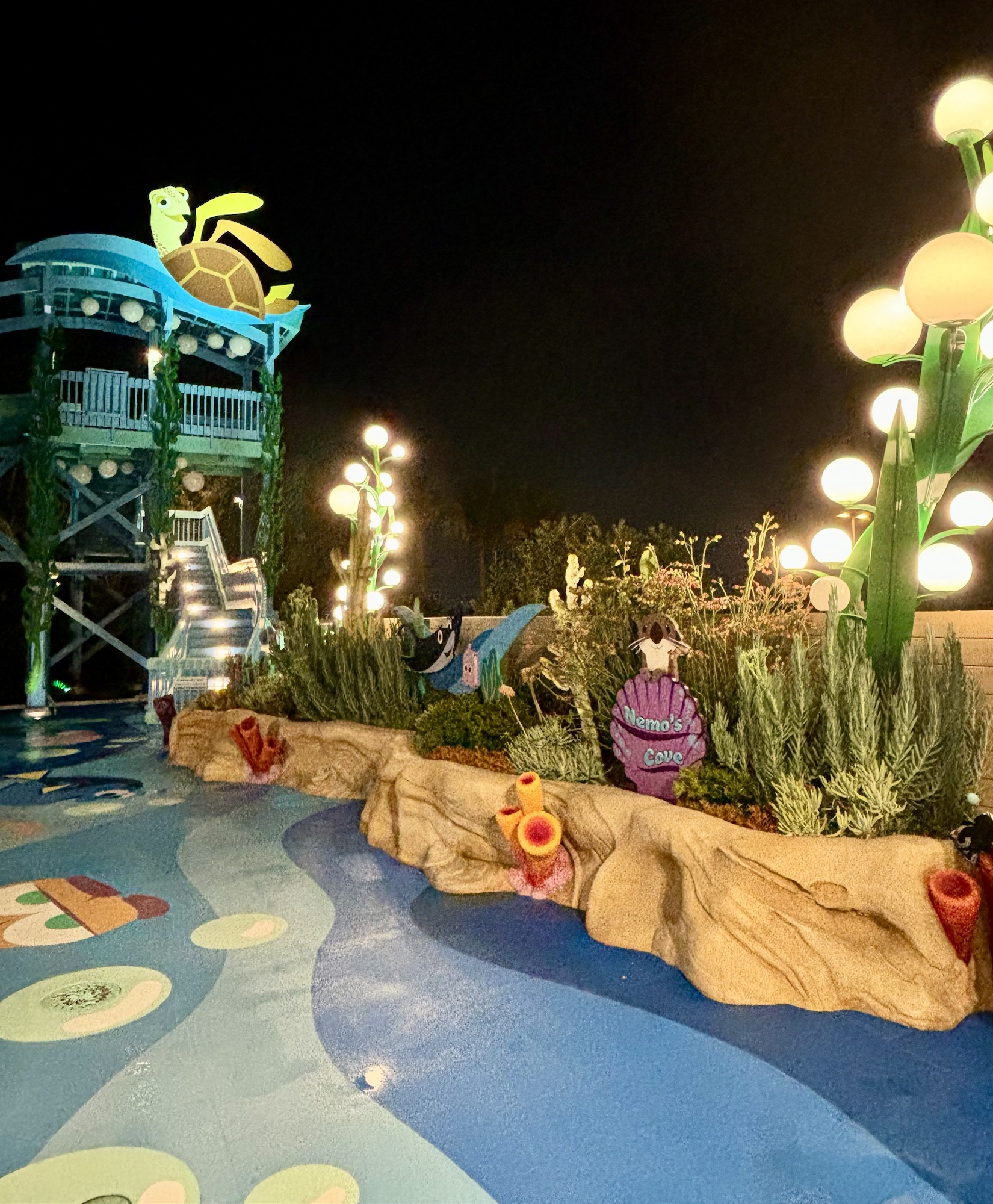 Speaking of that rooftop, we loved it! There’s a fabulous seating area to watch the fireworks, cute games for kids, a snack bar, and some super cool character fire pits. The rooftop is the perfect blend of swanky meets family-friendly, so kids and adults will both love it. The pool deck is a few steps up from the snack bar, and features a great pool, a jacuzzi, and a fun splash pad called “Nemo’s Cove.” The splash pad closes nightly at 9pm and the rest of the rooftop closes at 10pm.
