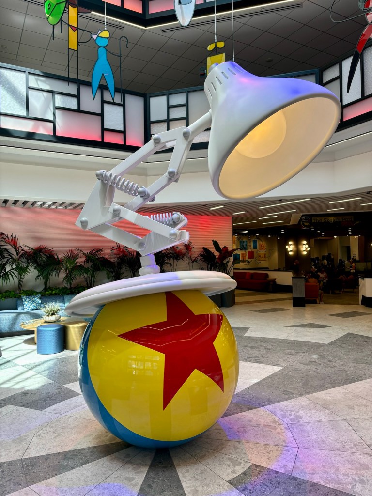 Entering the lobby of the newly reimagined Pixar Place Hotel is truly awe-inspiring. I didn’t feel like I was in a boring hotel with nothing but a check-in desk; I felt like I was wandering around an art museum! Pixar’s trademark desk lamp, Luxo, is bigger than life in the lobby, while artsy, colorful decor invites you to explore every inch of the inviting space.