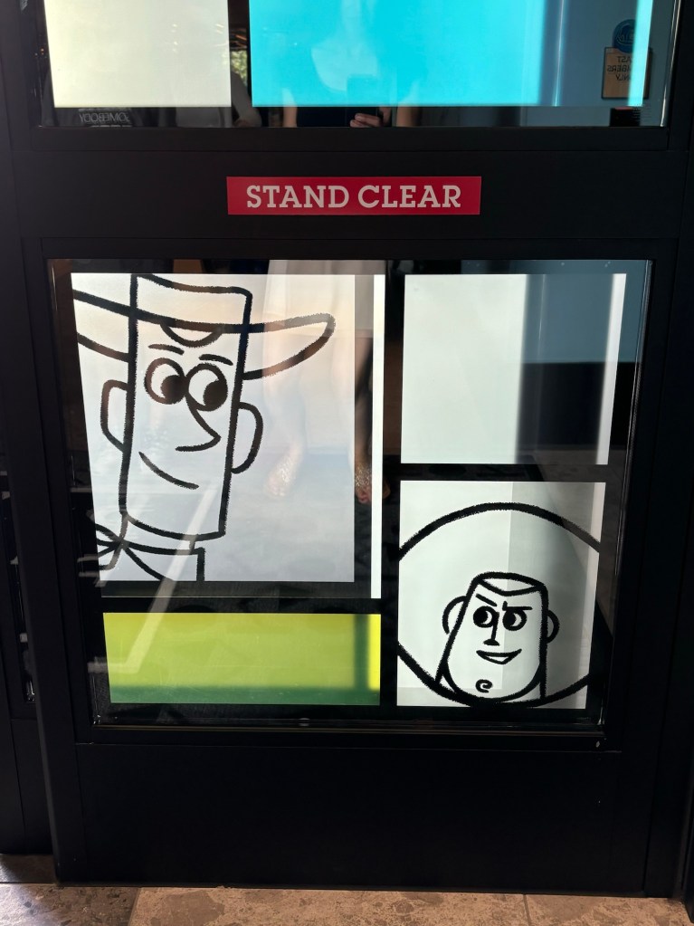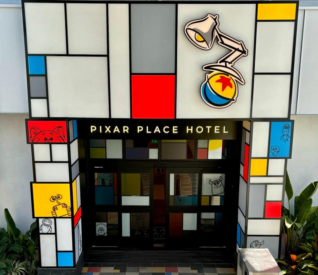 My favorite part about Pixar Place is its incredible theming (no pun intended.) The attention to detail in this newly themed hotel is amazing. Every touch of whimsy and each Easter egg delights guests of all ages! There are so many details you have to watch everything closely — like when the automatic doors open and Mike matches up with Sulley and Buzz matches up with Woody!