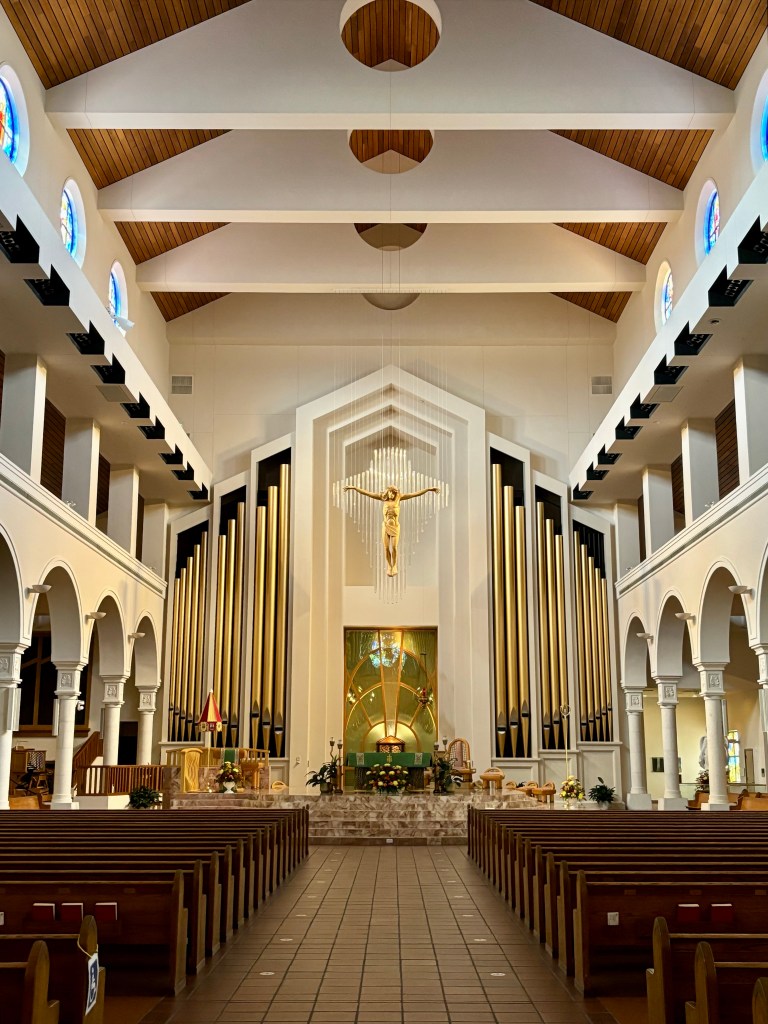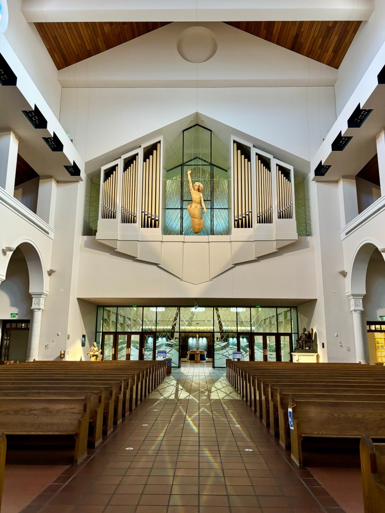 Once inside the building, you’ll enter the narthex — a lobby-like area opposite a church’s main alter that was typically found in early Christian or Byzantine basilicas. From in here, you can truly appreciate the glistening rose window at the top of the building. At the center of the modern but majestic narthex is a large baptismal font surrounded by two 30-foot tall mahogany arches, which the shrine describes as “a symbolic gateway ushering the faithful to the doors beyond and the Eucharistic presence of Christ.” Above the archway is an artistic representation of water. The entire area was designed by artist Jerzy Kenar.
