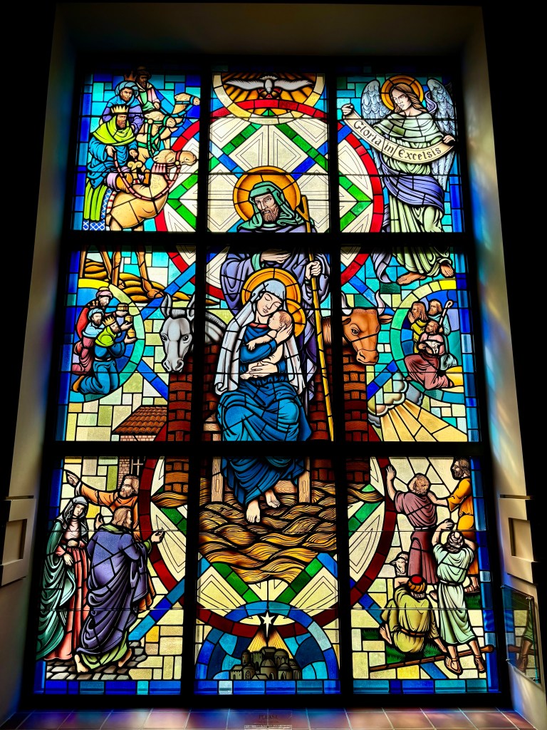 To the left of the alter is a beautiful sculpted scene featuring Saint Joseph at his workbench with Jesus, who is at an age rarely depicted by artists. The statues are illuminated by the stained glass window of the Holy Family behind them entitled “Rest on the Flight Into Egypt.”