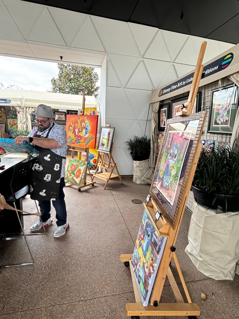 When you visit EPCOT during this festival, you have a fantastic opportunity to browse original art pieces by Disney Fine Artists — and meet some of them at the same time. Station after station of canvases are on display showcasing incredible work by artists from Thomas Kinkade to the voice of Mickey Mouse Bret Iwan, who we had the pleasure of meeting.