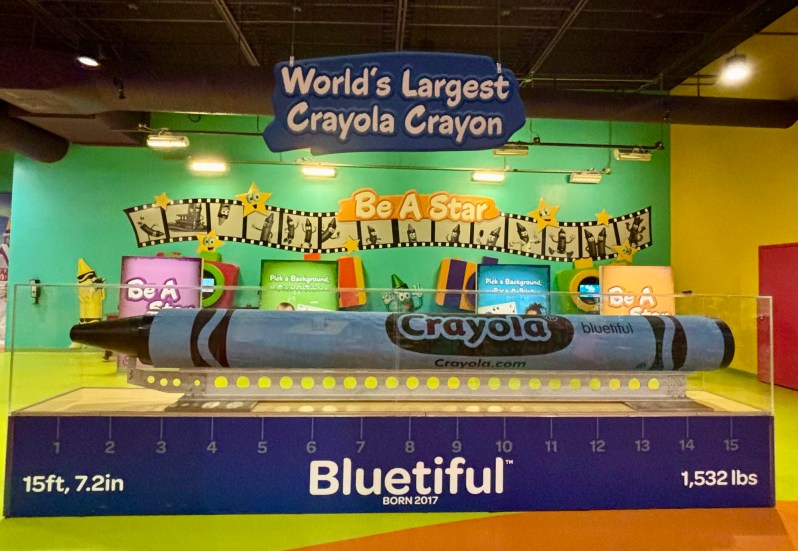 And you’ll definitely want to check out Bluetiful, the world’s largest Crayola crayon! Bluetiful is on permanent display here so it’s the only place you can find it now. Weighing in at 1,352 pounds and measuring 15.6 feet long, this real crayon is the real MVP of Crayola.