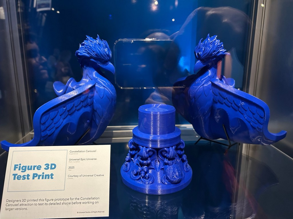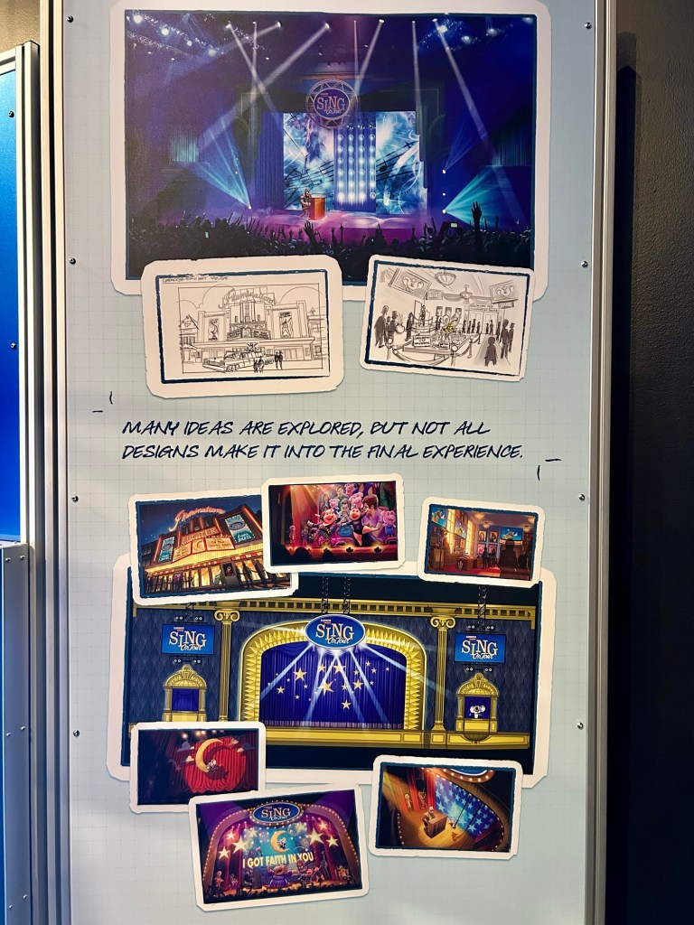 Alongside 3D models of the actual carousel in Epic Universe, we also saw the concept art for an interactive show based on the Sing movies that never came to fruition! Learning these little-known park secrets and seeing the behind-the-scenes designs were the best part of this exclusive exhibit.