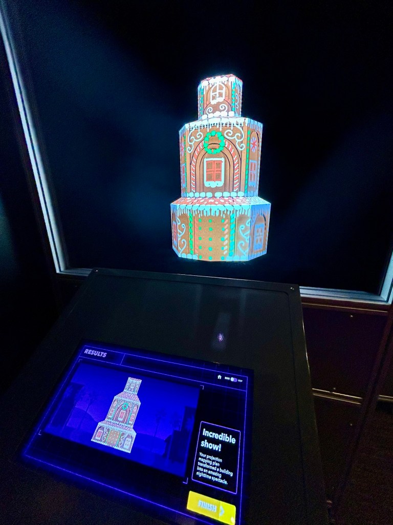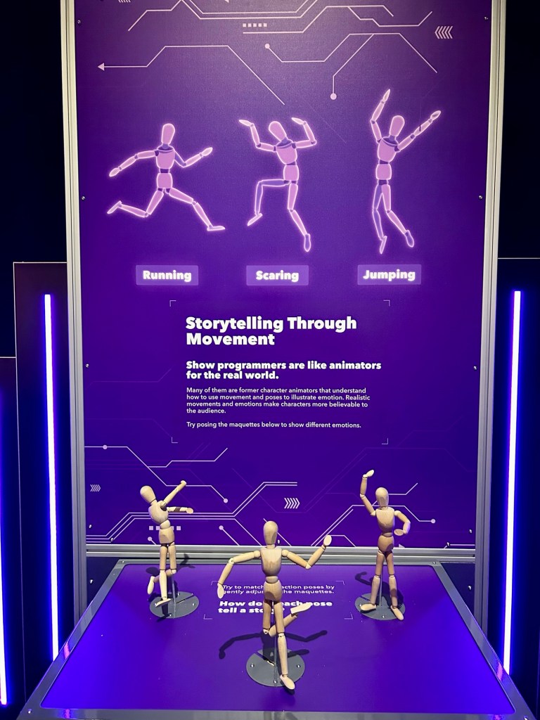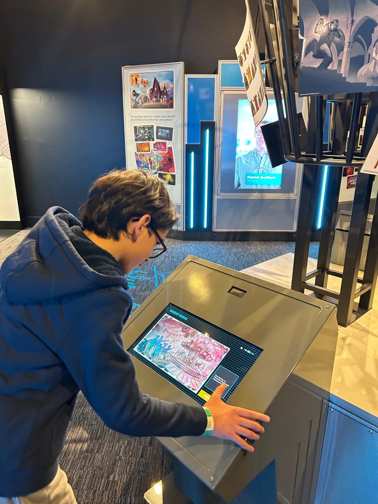 As a theme park lover and aspiring animator, my 11-year-old son loved this entire experience. He dreams of working with Disney Imagineering someday, and this exhibit was the first behind-the-scenes glimpse we’ve ever had into the “imagineering” equivalent of Universal Parks. Best of all, it’s not just pieces in glass cases — there are many interactive elements to the experience. The hands-on immersive aspects of the experience are the most popular parts, forming small lines in front of every station where excited guests of all ages wait to try their hands at theme park engineering and design.